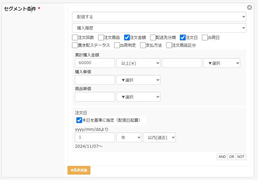 例えば「1年以内に60,000円以上購入したユーザー」を抽出したい場合には、下記のように設定してください。