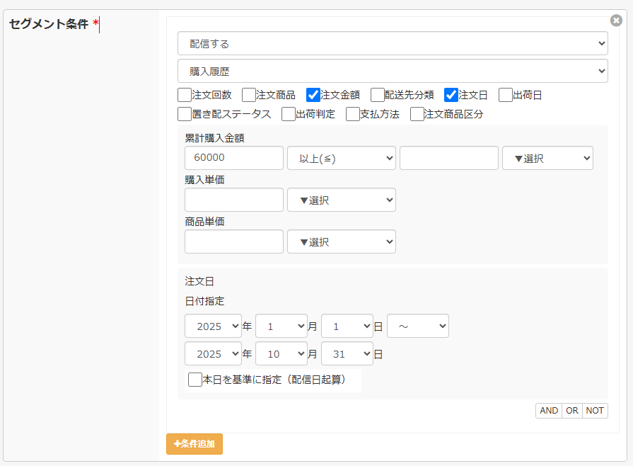 例えば「2025/1/1~2025/10/31の間に60,000円以上購入したユーザー」を抽出したい場合には、下記のように設定してください。