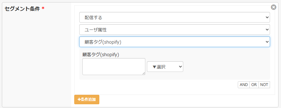 「ユーザ属性 > 顧客タグ(shopify)」を選択し、表れるテキストエリアに指定したい顧客タグを入力して下さい。