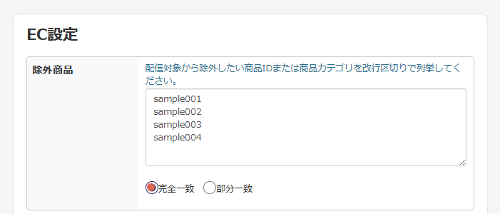 - 完全一致:入力された文字列と全く一緒のカテゴリ/商品 (を除外します。)