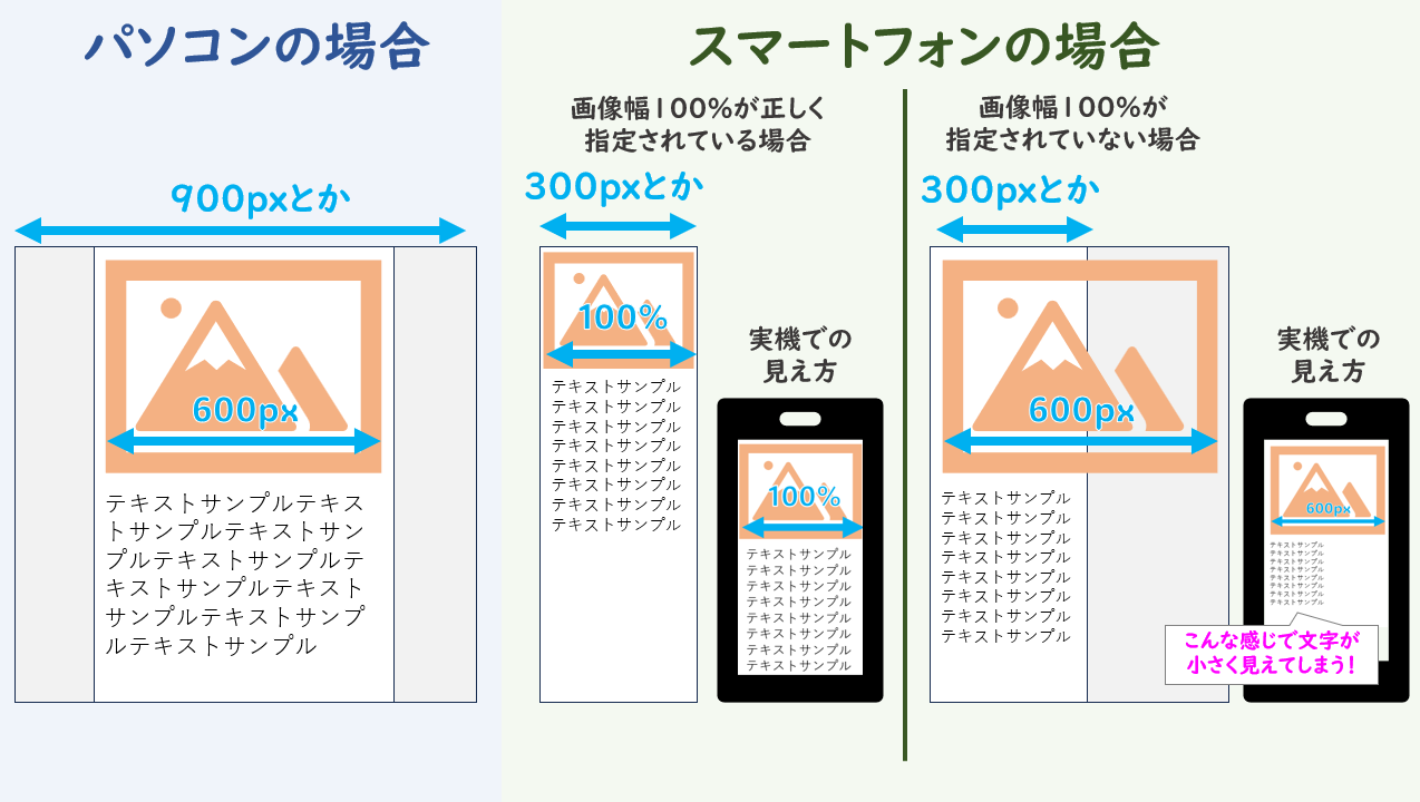 画像がある場合に正しくサイズ指定がなされていない場合に元のサイズのまま画像を表示しようとすることが原因で、相対的に文字が小さくなってしまいます。