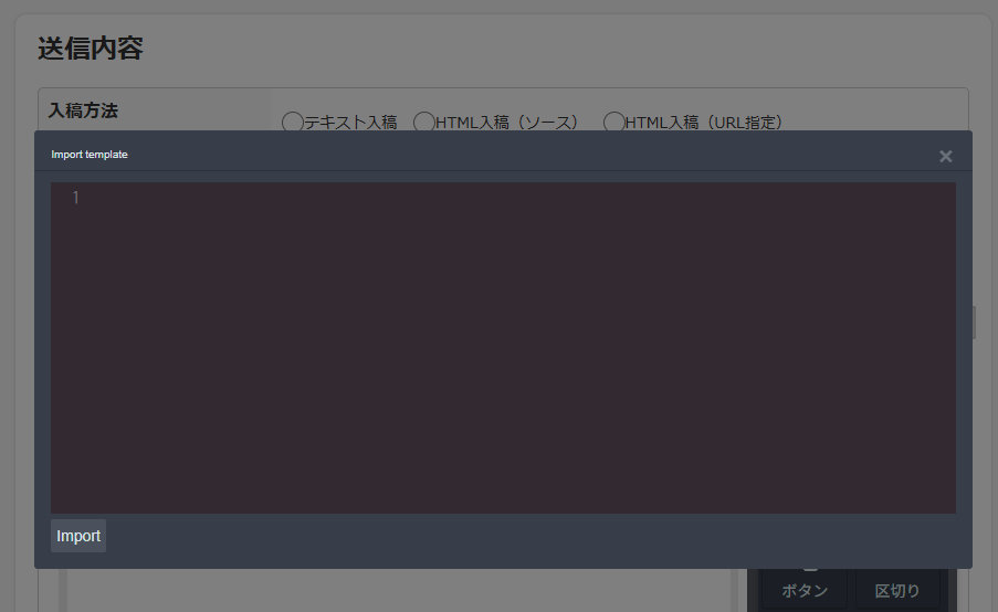 - 修正後のソースをコピーして、エディターのimport「↓」ボタンを押し、出てきたモーダルウィンドウに貼り付け、左下の「Import」ボタンを押す。
